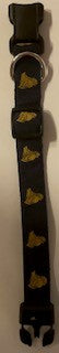 Adjustable Sizes. Woven Ribbon on Durable Nylon Webbing. Silver Nickel and Plastic Hardware for attaching a leash (sold separately).